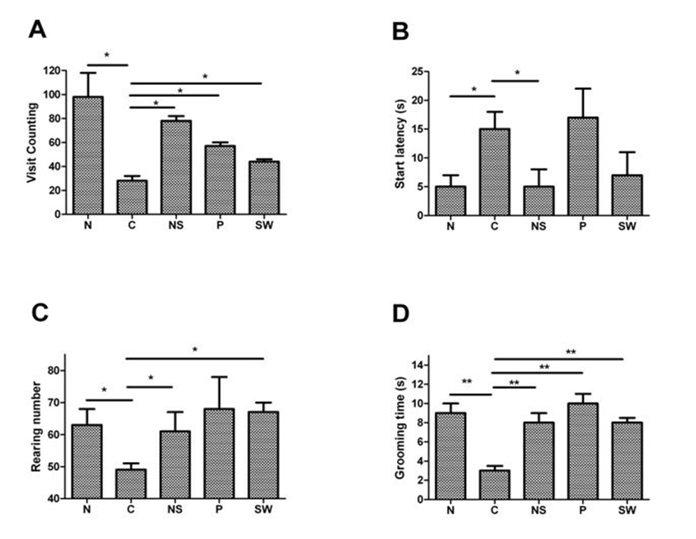 (Hiệu quả chống trầm cảm của NS dựa trên số lần truy cập (A), (B) số lần bắt đầu (C) và thời gian chải chuốt trong thử nghiệm ngoài trời sau khi điều trị chống trầm cảm trong 4 tuần cuối của CMS 8 tuần)