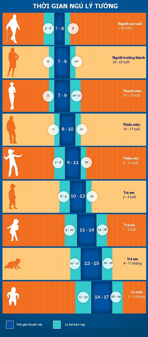 Thời gian ngủ trung bình ở mỗi độ tuổi sẽ khác nhau do nhu cầu năng lượng và hoạt động trao đổi chất khác nhau. Trẻ em giai đoạn phát triển cần rất nhiều thời gian ngủ để cơ thể phóng thích hormone tăng trưởng. Người cao tuổi thường cảm thấy khó khăn để đi vào giấc ngủ, tuy nhiên cũng cần ít nhất 7 tiếng mỗi đêm để đảm bảo sức khỏe thể chất lẫn tinh thần. Dưới đây là bảng tham khảo thời gian ngủ cho từng độ tuổi do Tổ chức Giấc ngủ Quốc Gia của Mỹ thực hiện: